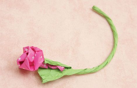 Com a fita adesiva junte a rosa feita com papel a um raminho de flores artificiais. Faça isso com as sete rosas de papel.