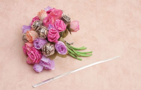 Com a fita adesiva junte todos os raminhos (os de flores e de bombons). E prenda tudo com o fecho prático.