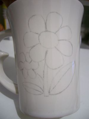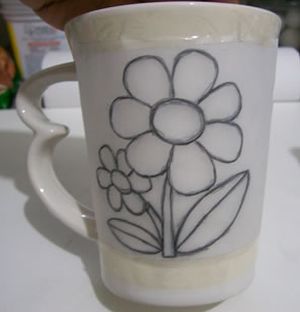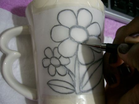 Em seguida transfira o risco para a caneca, passando o lápis por todo o desenho. Assim o grafite que estava no papel vegetal fixará na caneca.